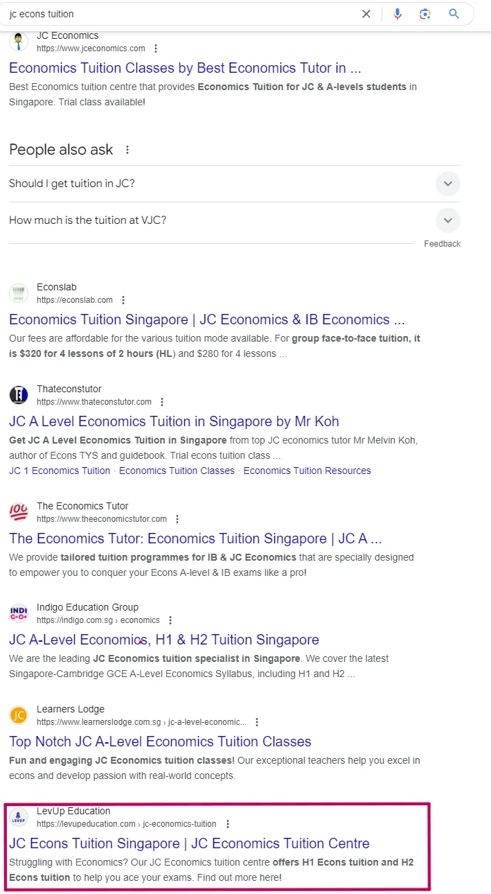 ✅Got on Google page 1 in less than 3 months for competitive keywords like JC Econs tuition and JC GP tuition.
