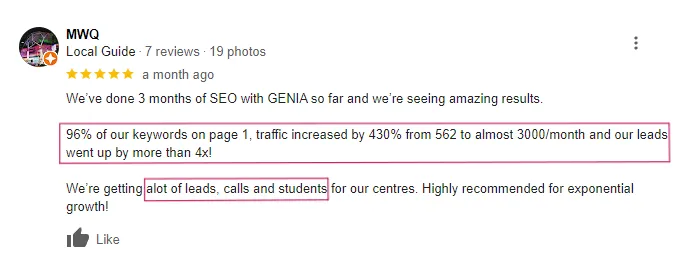 Our clients get 50-100 enquiries a month, and make $10k- $100k more in revenue a month from SEO alone.
